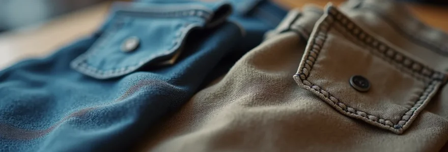 L’examen tactile permet de distinguer immédiatement les triples piqûres, reconnaissables par leurs trois lignes parallèles de fil, des coutures simples standard. Les surpiqûres visibles aux points stratégiques indiquent une volonté de doubler la résistance mécanique. Les points d’arrêt, ces petits rectangles de couture dense placés aux extrémités des poches ou des fentes, empêchent la propagation des déchirures accidentelles. Un acheteur averti consacre quelques minutes à inspecter visuellement ces détails avant de valider son choix.